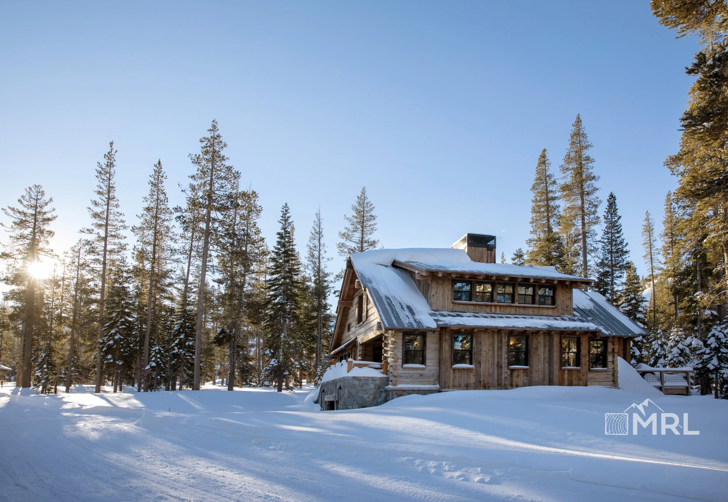 An alpine ski chalet in big snow country features MRL’s antique hand-hewn siding, original patina timbers, and rafter stock inside and out.